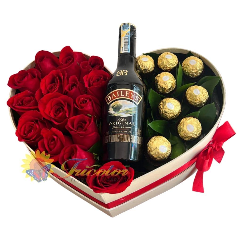 Sofisticado arreglo en caja en forma de corazón con rosas rojas, chocolates Ferrero y una botella de Baileys, ideal para sorprender con amor, elegancia y un toque especial en momentos inolvidables ❤️🍫🥂